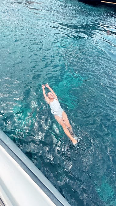 次は、海上でランチ&遊泳。ランチの前にプロセッコと前菜で乾杯。少人数ということもあり、参加者の皆様と仲良くコミュニケーションをとりながらの楽しい時間。(相変わらずコミュ力高めで、すぐ仲良くなりがち。笑)